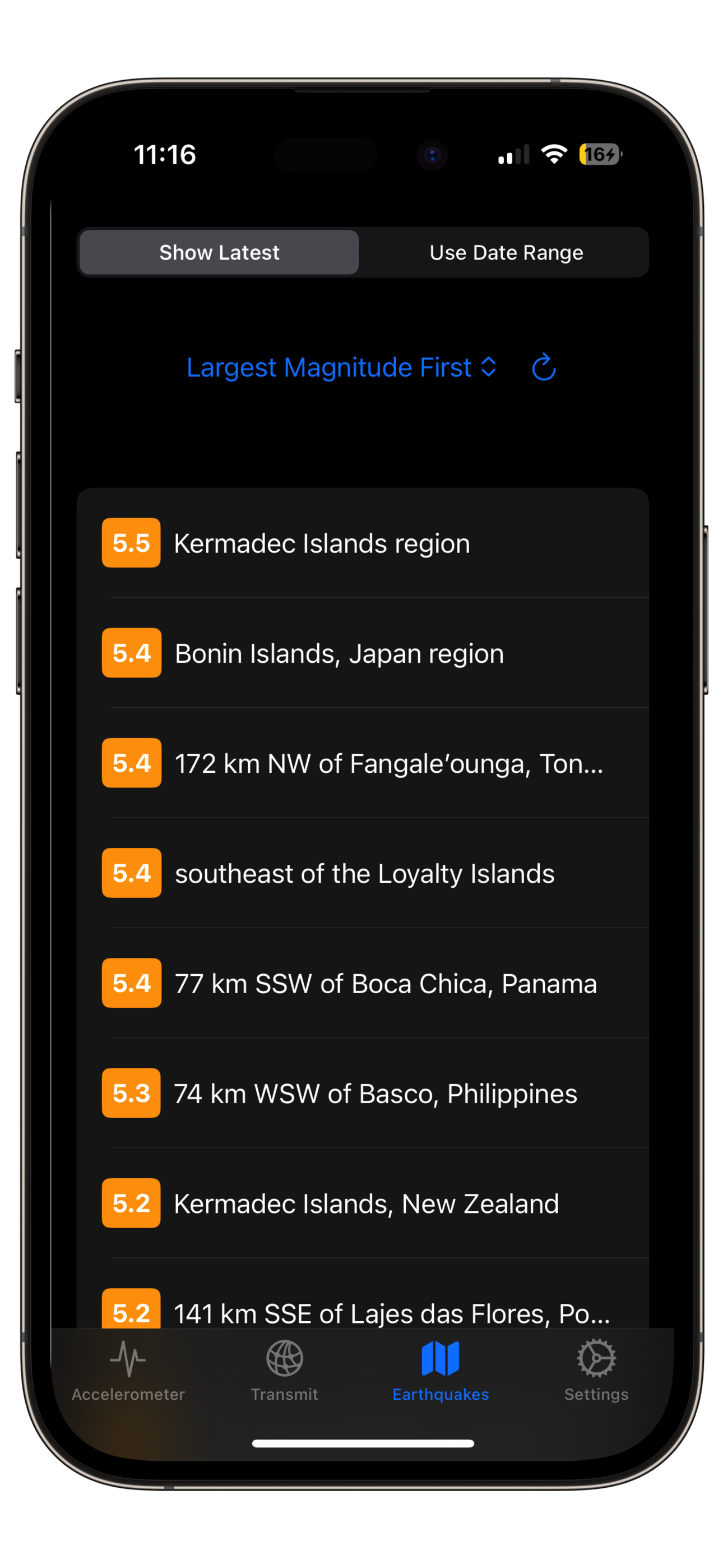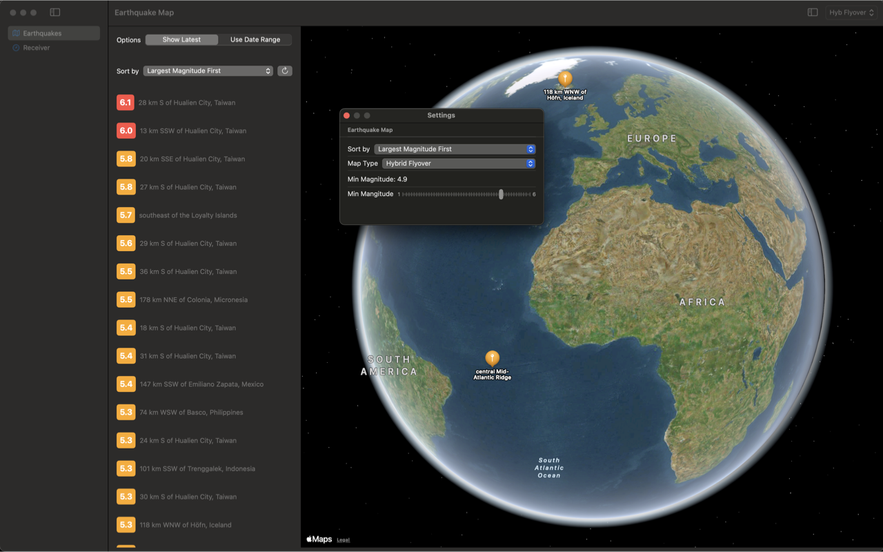 • Options for searching for earthquakes by magnitude and date